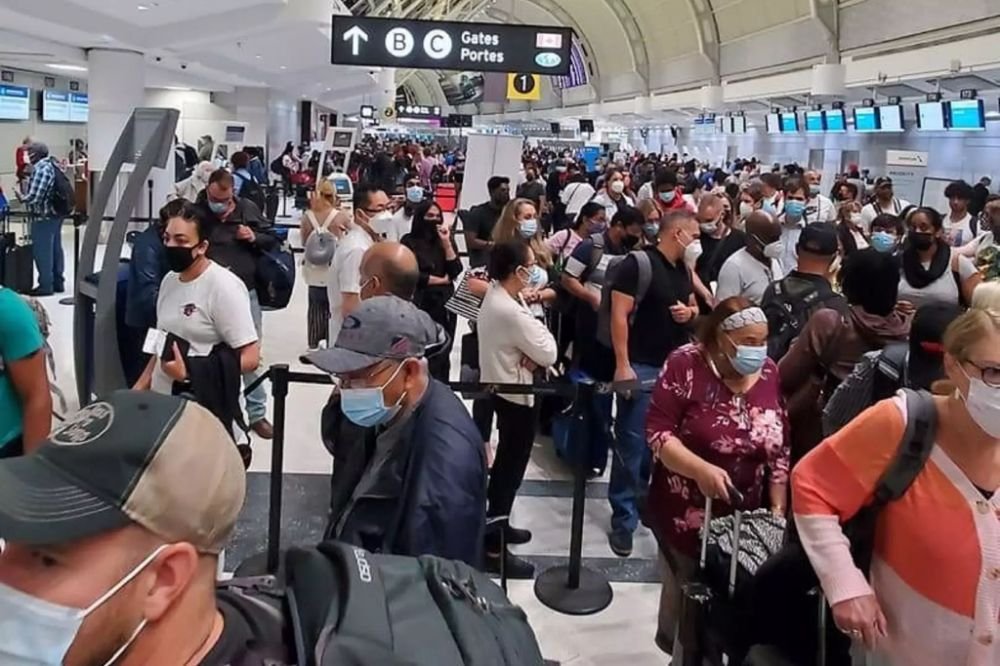 Travelers waiting at an airport during flight disruptions caused by geopolitical tensions.